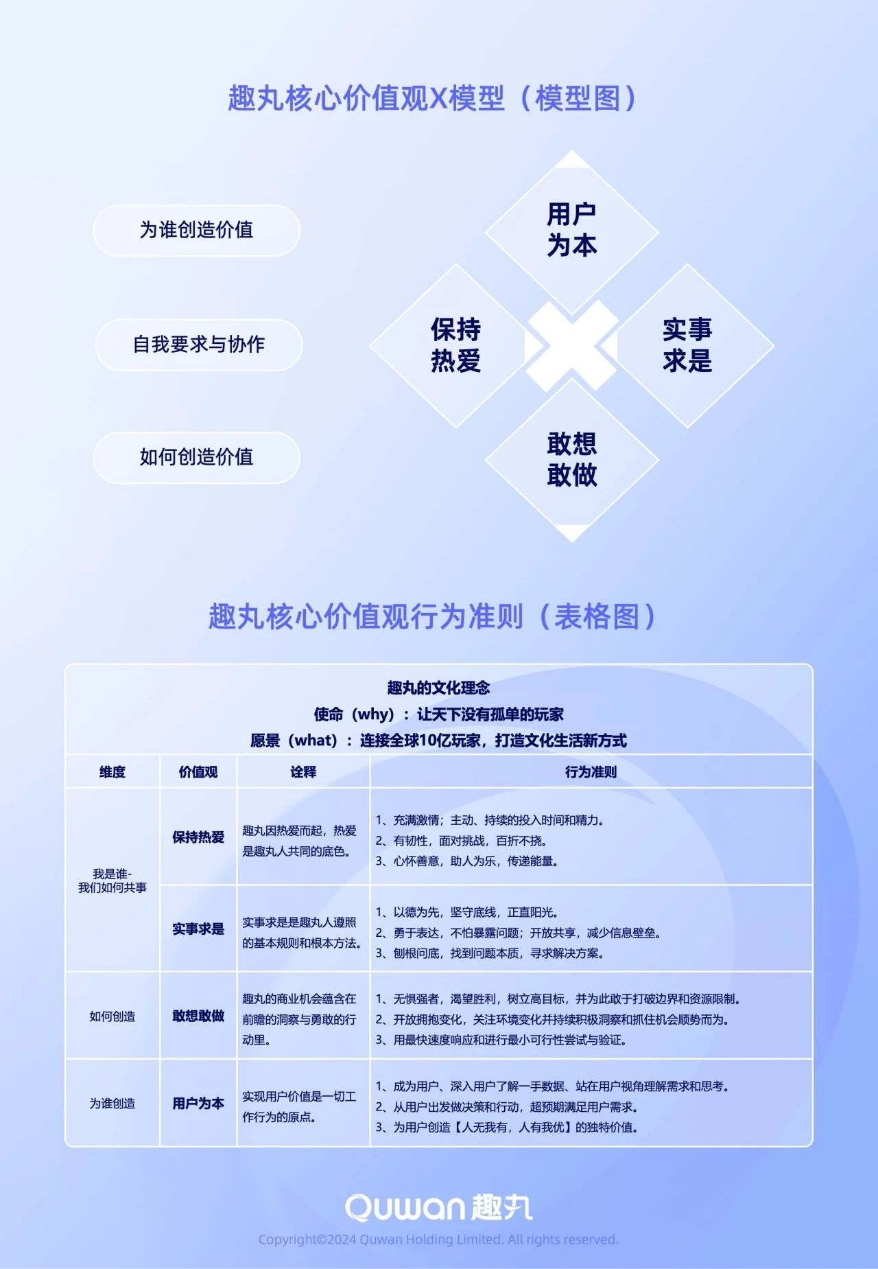 首先,我们一同来了解、熟悉我们这次迭代的趣丸核心价值观X模型。